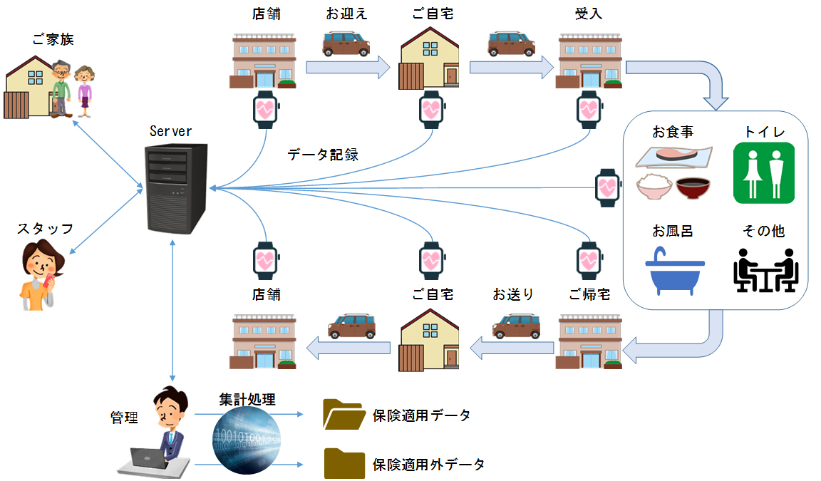 デイサービスにじいろ全店(20拠点・登録者500名)のデータ取りができるため、初期の段階で厚生労働省の科学的介護情報システム(LIFE)等の使用に合わせて開発を行い、所管の専門員と共同して用途変更を実施したい。